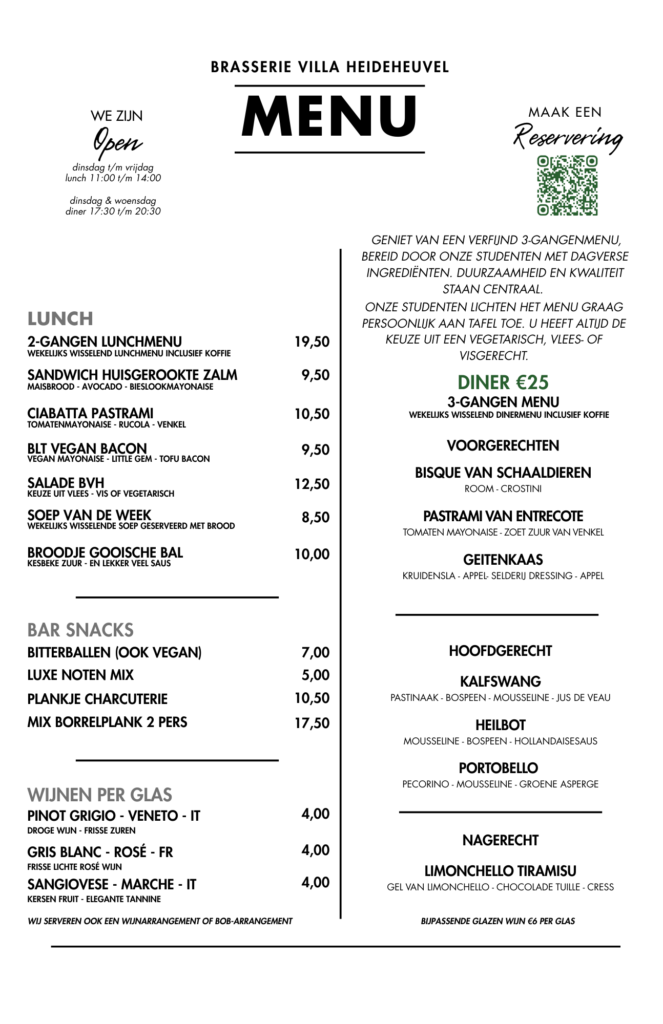 Kom snel langs bij Brasserie Villa Heideheuvel en laat u verwennen door de studenten met hun talent en enthousiasme. Ervaar de gastvrijheid van de toekomst in ons charmante Brasserie.